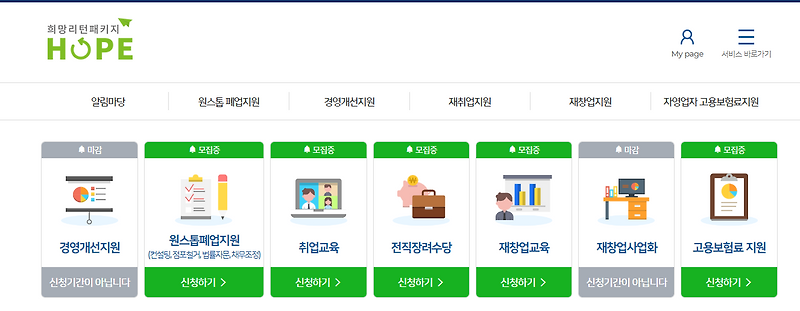 이 폐업지원금은 소상공인진흥원 홈페이지에서 확인하실 수 있으며, 희망반환패키지를 보시려면 “원스톱 폐업지원”을 클릭하세요.
