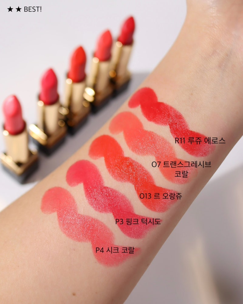 R11 루즈 에로스(R11 Rouge Eros)는 살짝 핑크빛이 도는 레드 립스틱이에요. 색상이 정말 선명하고 밝아요! 봄, 여름에 바르면 정말 예쁠 것 같아요. N5 트리뷰트 뉴디즈는 제가 정말 마음에 들었던 컬러인데, 베이스 립으로 사용해도 좋고 단독으로도 너무 예쁜 컬러에요. 살짝 누드톤이 가미된 핑크베이지 느낌이라 데일리 이브생로랑 립스틱으로 정말 추천드려요! N7 디자이어 로즈 로즈 컬러와 오렌지 브라운이 섞인 듯한 컬러였어요! 분위기 있으면서도 어둡지 않아서 데일리로 입기 딱 좋을 것 같아요! P3 핑크 턱시도 또 마음에 들었던 컬러에요. 플라워핑크 느낌인데 살짝 시원한 느낌이 있어서 정말 예뻐요! P4 시크 코랄 코랄에 핑크 립스틱을 섞은 듯한 느낌! 봄 웜톤에 잘 어울리죠?! O6 프레타포르테 크림슨 화사한 코랄 오렌지와 레드가 섞인 듯한 컬러에요! 발색이 얼마나 선명하고 촉촉한지 보이시나요?! O7 트랜그레시브 코랄로즈 컬러에 코랄을 섞어 누드스러움을 한방울 더한 느낌?! 웜톤이신 분들이 입으면 예쁠 것 같아요. 제가 너무 마음에 들었던 입생로랑 추천 립스틱 컬러인 N5 트리뷰트 누드를 입술 전체에 발라준 뒤, R7 루즈 인솔릿을 발라줬어요. 그라데이션으로 적용해봤습니다. 립스틱이 부드럽고 촉촉해서 이렇게 레이어드해도 좋을 것 같아요! 이브 생 로랑 뷰티의 신제품 루즈 푸르 꾸뛰르는 23.12.29 / 24.01.01 롯데온 공식몰 & 카카오톡 선물하기에서 만나보실 수 있습니다. 공식 출시일은 24.01.03입니다. 이 포스팅은 입생로랑 뷰티의 후원으로 작성되었음을 알려드립니다. 작성된 글입니다.
