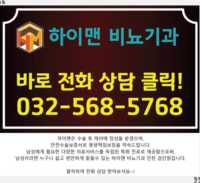 남성수술 잘하는 인천하이만비뇨기과는 전원 남성 스탭으로 구성되어 있으며, 비뇨기과 전문의가 풍부한 임상경험과 실력, 1:1 맞춤 상담, 서울 파주산까지 편리한 교통편을 제공합니다. 여러분의 자신감을 높여드리겠습니다! #남성수술 이벤트는 진행중인 이벤트를 참고해주세요.