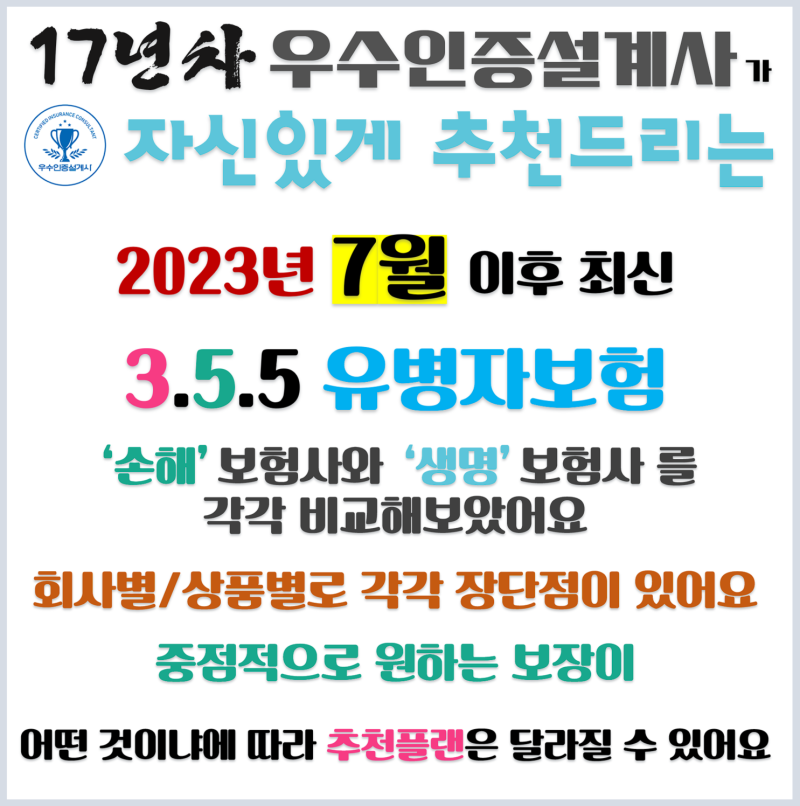 아픈 사람을 위한 보험은 무엇인가요? 쉽게 말하면 병력이 있는 사람이라도 가입할 수 있는 보험이다. 보험 가입 시 과거 병력을 통보하고 심사를 받게 됩니다. 이때, 귀하가 앓고 있는 질병의 종류, 어떠한 치료를 받았는지에 따라 표준표준플랜에 가입하기 어려울 수도 있습니다. , 보험료, 장기 보장이 적용될 수 있습니다. 이런 분들의 경우, 병자보험을 통해 통지 의무를 더욱 완화함으로써 큰 ​​추가 요금이나 보장 없이 준비할 수 있다는 점을 이해하실 수 있습니다. 면책사항 요약 표준계획 면책사항 일반적으로 기저질환자가 아닌 일반 표준계획 보험에 대한 면책사항은 3.1.5를 참조하여 다음과 같습니다. 3개월 이내에 병원을 방문했거나 진료를 받은 자 의사의 검사 또는 검사를 받고 특정 질병이 있는 것으로 확인된 경우 의심스러운 소견, 입원, 치료, 수술, 약물치료 등을 받은 적이 있는지 여부 최근 1년 이내에 의사에게 검사 또는 검사를 받고 재검사를 받았는지 여부 추가로 테스트했습니다. 최근 5년 이내에 병원에 입원 또는 수술을 받은 적이 있거나, 7일 이상 치료를 받은 적이 있거나, 30일 이상 약을 복용하고 있거나 심각한 질병으로 진단받은 적이 있습니까? *중대질환 : AIDS 및 HIV, 암, 백혈병, 뇌졸중, 고혈압, 협심증, 심근경색, 심장판막, 당뇨병, 간경변증(중증질환으로 분류되는 질환)은 회사마다 조금씩 다를 수 있습니다.) 3.5.5 면책사항 기저질환자를 위한 플랜 기저질환자를 위한 보험 중 가장 가성비 좋은 355플랜의 면책사항을 확인해보자. 3개월 이내에 병원을 방문하여 입원이 필요하다는 의사의 소견을 받고 수술을 하세요. 이것이 필요하거나 추가 테스트/재검사가 필요하다는 결과를 받으셨나요? 5년 이내에 병원에 입원했거나 수술을 받은 적이 있습니까? 귀하는 5년 이내에 심각한 질병을 진단받은 적이 있습니까? (암, 뇌졸중, 협심증, 심근경색, 간경변, 만성신장질환) 그래서 기준과 고시를 비교할 때 355는 1년이 아닌 최근 3개월간 추가검사/재검사 유무와 치료 여부를 살펴본다. 5년 이내에 7일 이상. 30일 이상 약을 먹지 않기 때문에 안심이 많이 됩니다. 또한, 고혈압, 심장판막, 당뇨병도 중증질환에서 제외되므로 만성질환자도 가입이 가능합니다. 신고기간은 3개월/5년/5년입니다. 앞의 숫자를 따서 355라고 합니다. 여기서는 수술기간이나 입원기간이 5년 이내인지에 따라 315, 325, 335, 345, 355로 나누어 계획을 세웁니다. 그래서 3N5 요금제 중 N의 고지기간이 더 짧습니다. 예고기간이 길어질수록 가입이 쉬워지고 보험료는 비싸지고, 반대로 예고기간이 길어질수록 가입이 어려워져 보험료가 비싸진다고 생각하시면 됩니다. 더 저렴합니다. 기저질환자 보험 플랜 비교 : 40세 남성 기준 “20년 납입, 90세 만기 / 355 플랜 / 무해지형 / 암 3,000, 뇌혈관질환 2,000, 허혈 2,000” 여성과 여성이 있어서 결제수수료가 저렴하다고 3개 업체를 비교해 봤습니다. 40세 이상 남성의 건강상태를 비교한 보험상품은 A사가 74,402원으로 가성비가 가장 높았다. 다음은 B사 81,852원, C사 82,232원으로 ​​B사가 근소한 차이로 2위를 차지했습니다. 다만 1위를 차지한 A회사와 비교하면 약 7000~8000원 정도 차이가 났다. 40대 여성의 경우 여성 순위가 남성과 비슷했다. 가성비는 A회사가 56,119원으로 가장 높았고, B회사가 67,564원, C회사가 70,293원으로 뒤를 이었습니다. 가장 인상적이었던 것은 A사와 C사의 가격 차이였다. 약 14,000원으로 꽤 큰 차이가 났다. 기존 질환이 있는 사람들에게 권장되는 보험 플랜은 무엇입니까? 위 비교 디자인을 보면 알 수 있듯이 동일 보장 대비 가성비가 가장 좋은 회사는 A회사였습니다. 40세 기준으로 여성은 56,119원, 남성은 74,402원이었습니다. (9월 기준 비교이며, 연령, 직업, 병력 등에 따라 유리한 조건을 제공할 수 있는 업체가 다를 수 있음을 참고하시기 바랍니다.) 현재 고혈압 약을 복용 중인 만성질환자, 당뇨병은 또한 만성 질환을 앓고 있는 사람들을 위한 보험에 가입할 수 있습니다. 그러니 불가능하다고 생각하지 마세요. 공지 사항을 검토하고 어떤 플랜이 귀하에게 가장 적합한지 알아보세요. TIP 환자+표준플랜의 결합 환자플랜은 신고의무를 완화하므로 표준플랜에 비해 납부수수료는 당연히 비싸지만, 일반 표준보험료에 비하면 경우에 따라 저렴할 수도 있습니다. 따라서, 내역과 보험료에 따라 유리한 조합이 달라질 수 있습니다. 예를 들어 고혈압/당뇨병 환자를 일반표준체계에 등록하게 되면 뇌/심장질환 관련 진단비가 자연스럽게 늘어나게 된다. 따라서 이 경우 암을 표준제도로 하고 뇌/심장질환을 별도로 하나로 가입하시면 하나로 가입하실 수 있습니다. 그냥 준비하시는 것보다 더 저렴하고 효율적으로 준비하실 수 있습니다. ^^ps. 질환자용 제품 추천 견적이 필요한 회원이시라면, 아래 톡톡이나 퀵신청 링크를 통해 문의 남겨주시면, 꼼꼼히 비교하여 가장 유리한 견적을 보내드리겠습니다. 궁금하신 점은 네이버로 문의주세요! https://naver.me/FPe9YS7x 최저가보험 1:1 보험문의 & 견적요청 생명/나메이지 여러 보험사의 상품을 분석하여 허용 보험료 예산 내에서 가장 