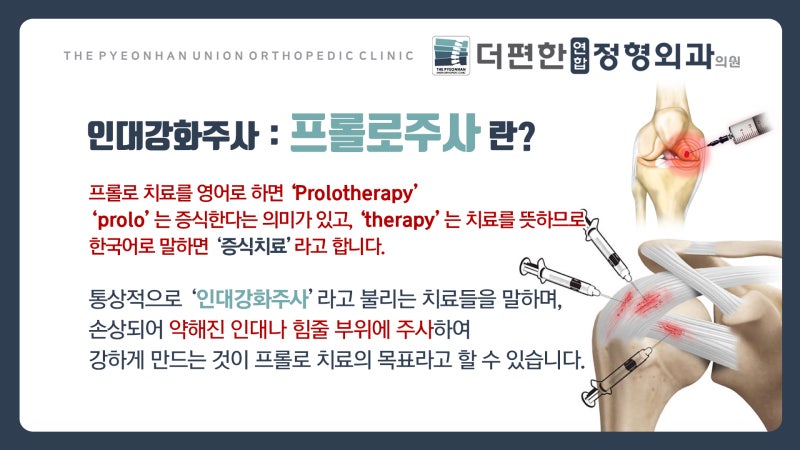 프롤로주사는 ‘프롤로테라피’라는 뜻입니다. 프롤로테라피는 증식(Proliferation)과 치료(Therapy)의 합성어로 증식치료를 뜻합니다. 그럼 여기서 증식은 무슨 뜻일까요? 손상된 부위의 치료와 재생에 필요한 세포와 조직을 증식시키는 것을 뜻하는데, 궁극적으로 신체의 재생 반응을 촉진하는 치료 방법을 의미합니다. 프롤로테라피는 염증 반응을 일으키는 물질을 병변 부위에 주입하여 손상된 인대와 힘줄을 재생시키고 통증을 줄이는 주사 치료 방법입니다. 조직의 재생과 증식을 유도하고 근본적인 원인을 치료하는 방법으로 볼 수 있습니다.