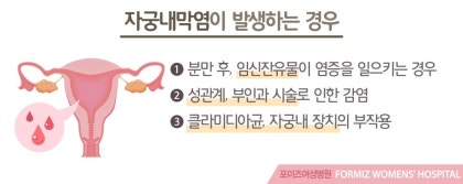 자궁 안쪽에 염증이 생기는 이유는 외부와의 접촉 기회가 많아질 때로 자연분만이나 , 유산, 피임기구 삽입, 내부 태아 모니터 등으로 인해 생길 수 있습니다. 원인 중 가장 발견되는 원인이 바로 산후 감염인데, 산후에는 태반을 잘라 벌어지는 상처로 감염이 될 가능성이 높습니다. 출산을 하다 보면 생기는 부산물인 오로나 괴사조직이 세균의 번식을 돕기도 하는데, 분만 후에 체온이 오르면 질병의 감염을 의심해 봐야 합니다.