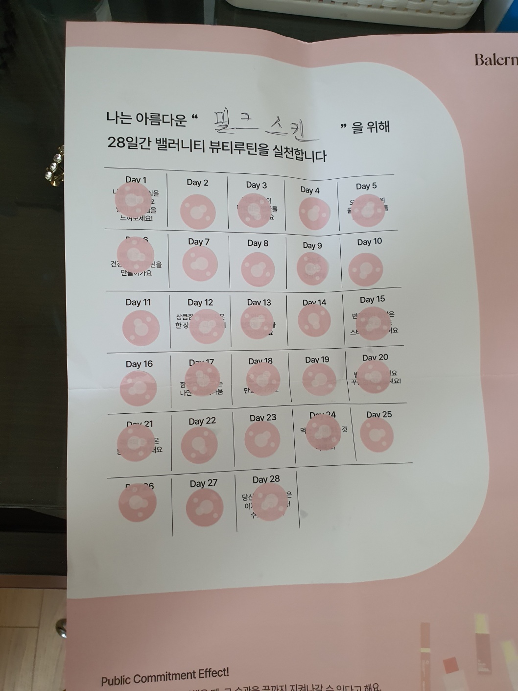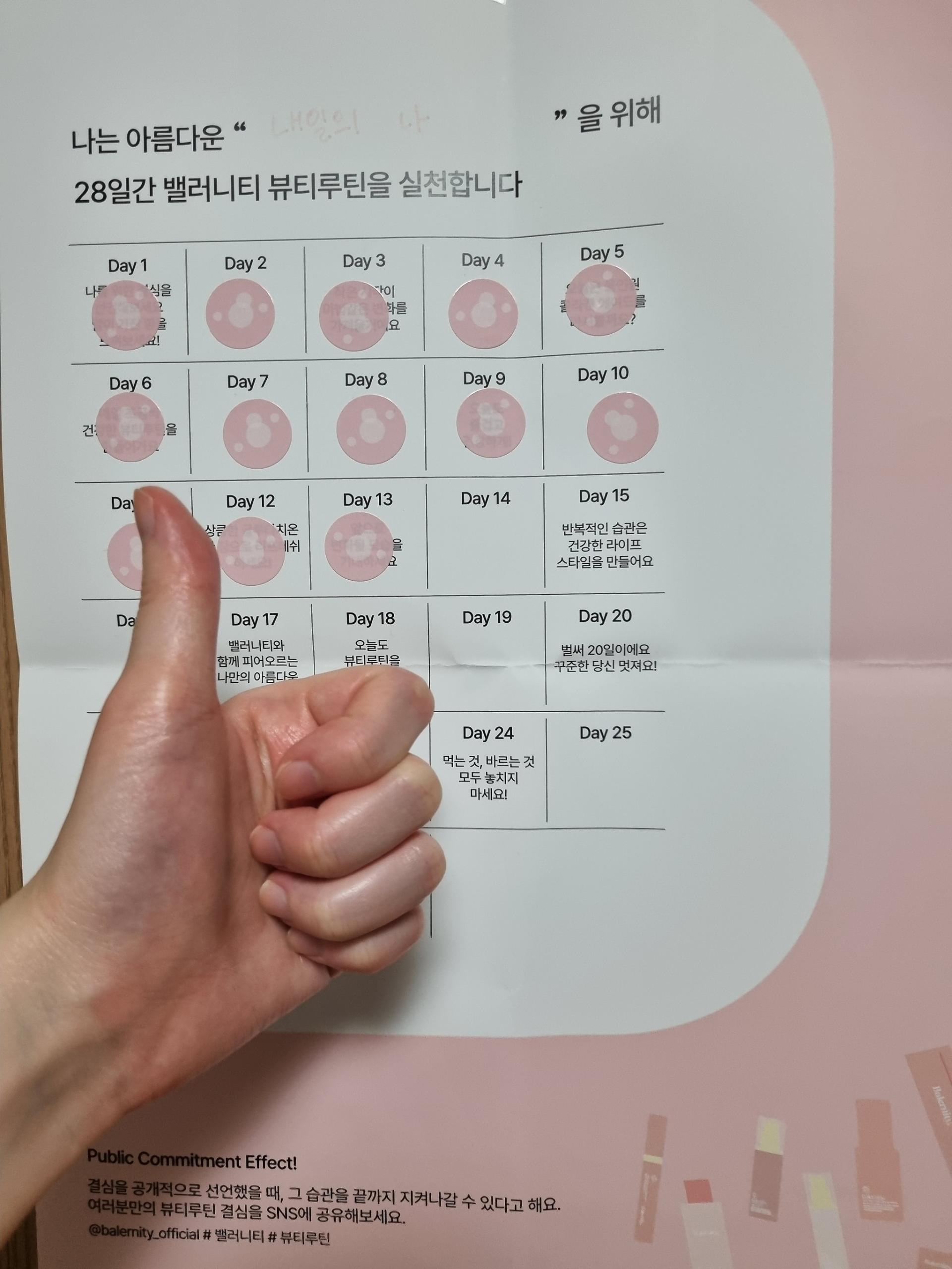 키트에는 챌린지용 달력과 스티커가 포함되어 있어서 매일매일 챌린지를 하고 있다는 사실도 잊지 않았어요! 신발장 근처 벽에 붙여두고 스티커를 붙여서 매일 확인했어요.