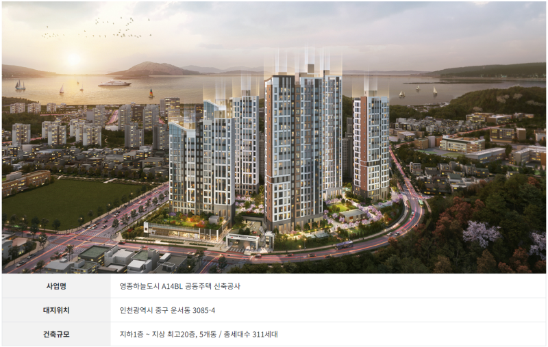 인천 중구 운서동 A14블록, 대지 약 7,045평, 지하 1층~지상 20층, 5개동, 총 311세대, 84세대(84세대), 34세대 (34평), A//B//C 3종, 주차대수 : 411대 (가구당 1.32대) 2026. 12월 입주 예정
