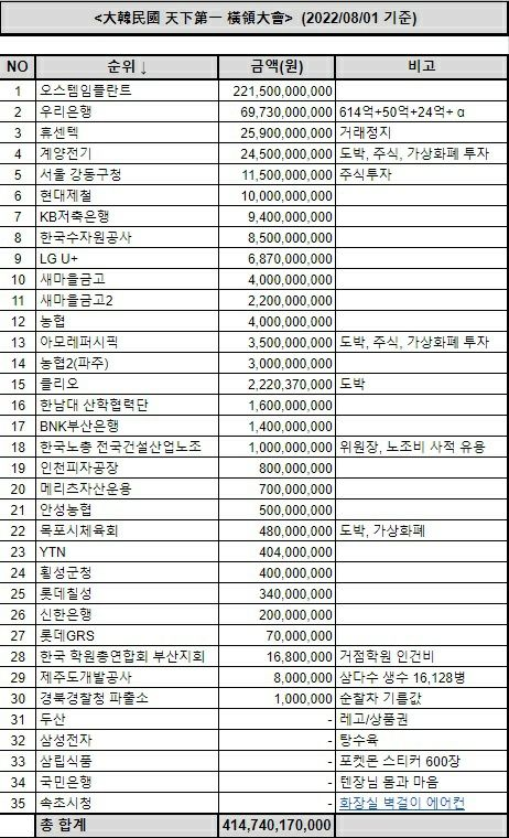 아직 연휴가 끝나지 않아 비트코인, 주식 등에 관한 정보가 많지 않고, 주말이 끝나가는 시점이라 주제가 가볍지도 않지만 최근 나온 국내 횡령 순위를 정리해볼까 합니다. 이슈가 되다. 오스템인플랜트의 막대한 횡령 여파로 각종 기업과 금융위원회, 금융위원회가 조사에 착수하자마자 엄청난 규모의 횡령 사건이 발생하고 있다. 은행, 공기업, 대기업, 시군구청 등 다양한 기업이 있는 상황에서 최근 BNK경남은행의 3000억원대 횡령 소식이 터져 충격을 안겼다. 훨씬 더 크다. 현재 커뮤니티에 유포되고 있는 9월 20일 기준 최신 컨텐츠를 기준으로 횡령 순위를 정리할 예정이니 가볍게 읽어보시기 바랍니다. ※ 이 글은 사실과 다를 수 있으며, 판단은 각자가 하시기를 바랍니다. 1. BNK경남은행 : 2,988억원